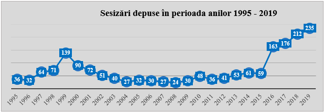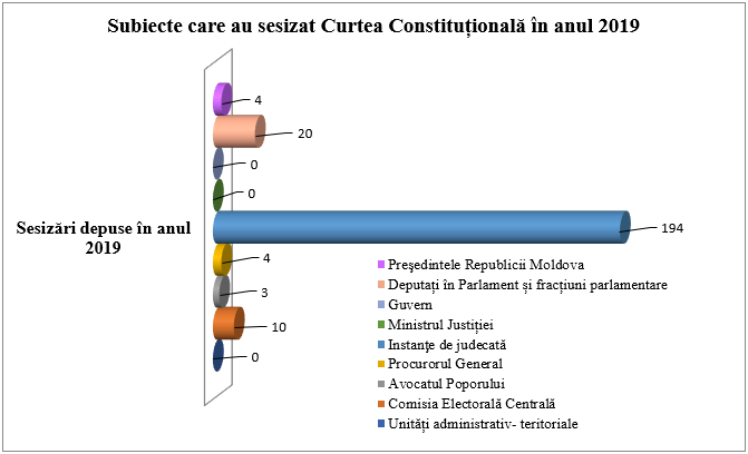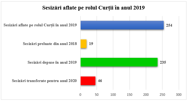 Pe parcursul anului 2019 la Curtea Constituțională au fost depuse 235 de sesizări, 19 sesizări au fost preluate din anul 2018, astfel încât sarcina Curții în anul 2019 a constituit 254 de sesizări aflate pe rol, dintre care 46 de sesizări au fost transferate pentru anul 2020 (a se vedea diagrama nr. 1 din Anexa nr. 1).