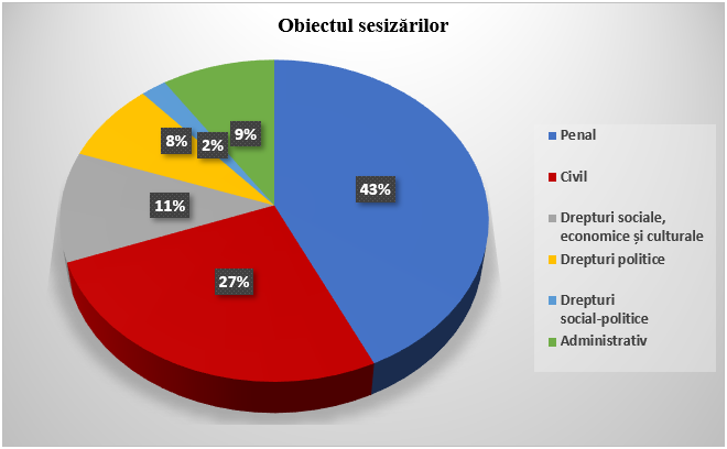 După obiect, din totalul sesizărilor depuse la Curte în anul 2019, în cea mai mare parte au fost contestate prevederi normative din domeniul penal (43%), fiind succedat de cele din domeniul civil (27%), domeniul drepturilor sociale, economice și culturale (11%), domeniul administrativ (9%), domeniul drepturilor politice (8%) și drepturilor social-politice (2%) (a se vedea diagrama nr. 16 din Anexa nr. 1).