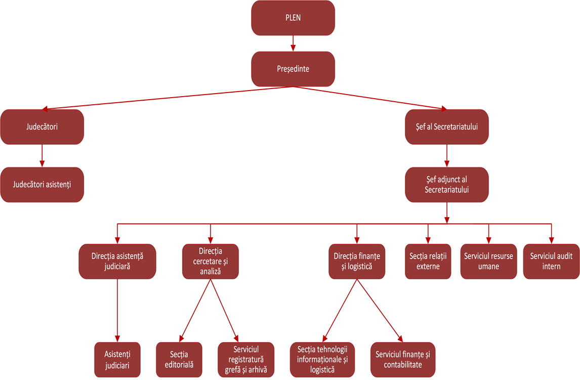 Pe parcursul anului 2019 Curtea și-a desfășurat activitatea în conformitate cu structura organizatorică aprobată prin Decizia nr. 9 din 23 martie 2018, după cum urmează: