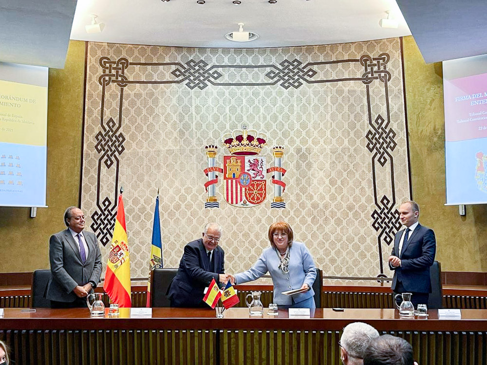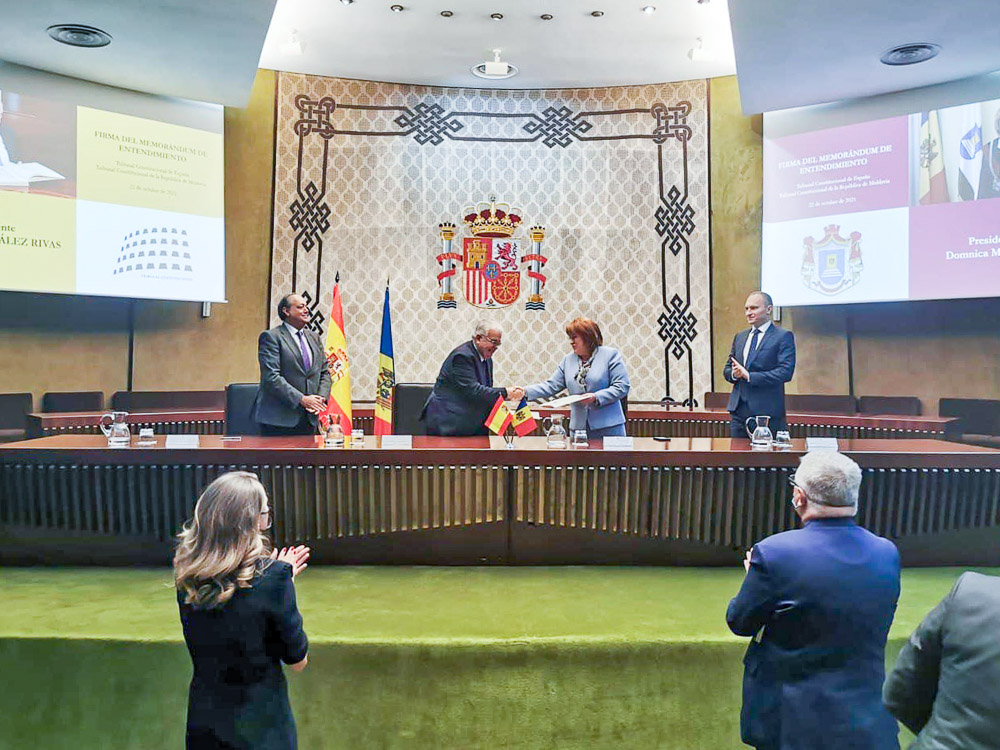 2021 Semnarea unui memorandum de înțelegere între Curtea Constituțională a Republicii Moldova și Tribunalul Constituțional al Regatului SpanieiVineri, 22 octombrie a.c., Președintele Curții Constituționale a Republicii Moldova, dna Domnica Manole, a semnat împreună cu Președintele Tribunalului Constituțional al Regatului Spaniei, dl Juan José González Rivas, un memorandum de înțelegere între cele două instituții.Memorandumul constă în asigurarea unui cadru de cooperare în domeniul dreptului constituțional. El va permite, între altele, schimbul reciproc de informații și de experiență în domeniul justiției constituționale, dezvoltarea capacității instituționale prin intermediul vizitelor reciproce, a programelor de schimb profesional, a stagiilor de practică, a cursurilor profesionale, a seminarelor și a cercetărilor comune sau sprijinirea reciprocă la organizarea conferințelor, a congreselor, a seminarelor și/sau a altor activități privind chestiunile judecătorești și juridice de interes reciproc. Bazele acestui memorandum au fost puse în luna iulie a anului curent, iar semnarea sa a avut loc la Madrid, prin amabilitatea Tribunalului Constituțional spaniol, în cadrul unei ceremonii transmise online.