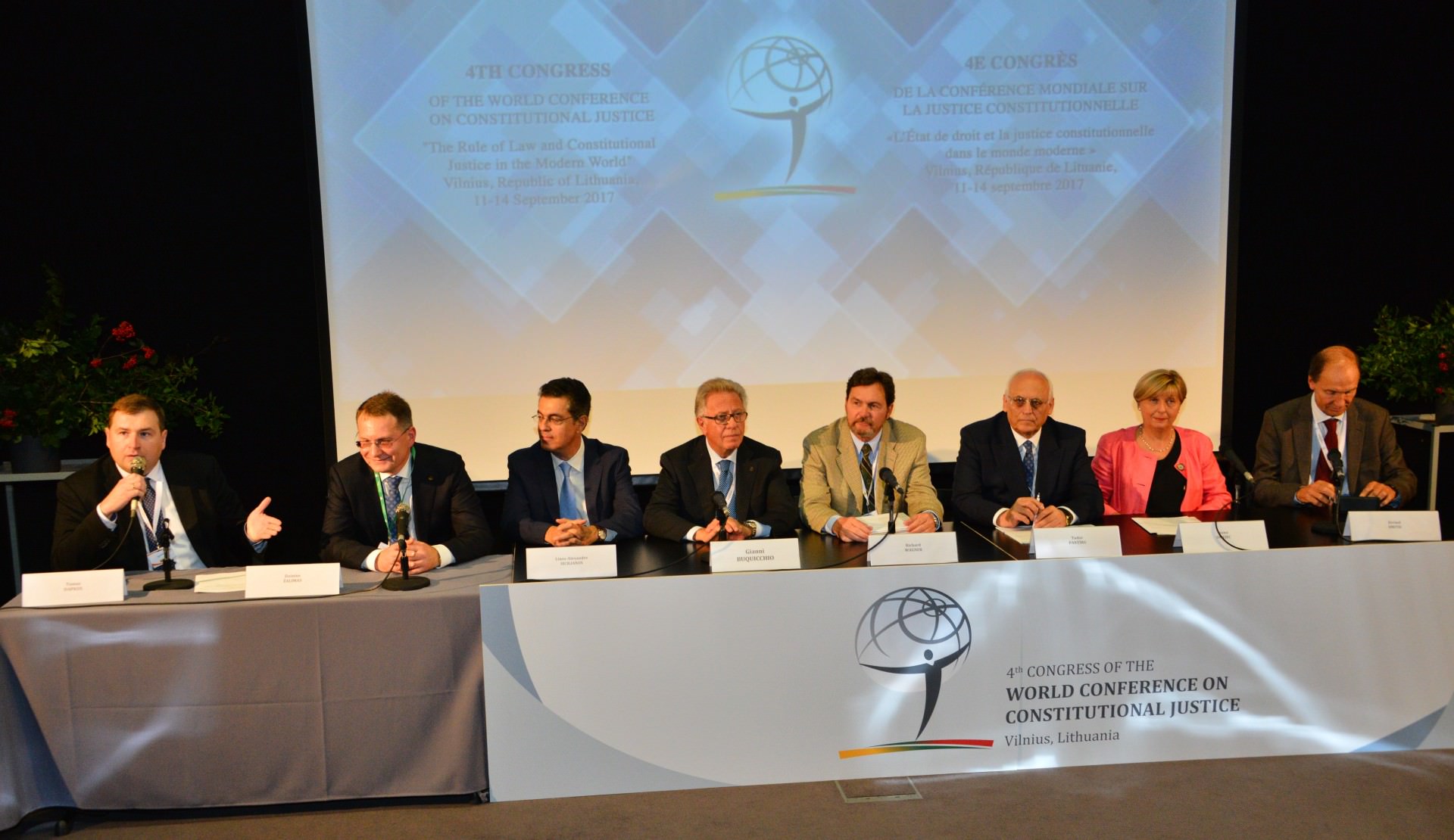 2017 Participarea delegației CCM la cel de-al IV-lea Congres Mondial al Justiției ConstituționaleDelegația Curții Constituționale participă la lucrările celui de-al IV-lea Congres Mondial al Justiției Constituționale (World Conference of Constitutional Justice), care se desfășoară la Vilnius, Lituania, în perioada 11-14 Septembrie 2017. CCM este reprezentată de către Președintele Tudor Panțîru, judecătorii Aurel Băieșu și Igor Dolea, precum și judecătorul-asistent șef Rodica Secrieru. Scopul celui de-al IV-lea Congres WCCJ constă în promovarea la nivel internațional a dialogului între judecătorii instituțiilor de jurisdicție constituțională, precum și consolidarea justiției constituționale ca un element de bază a democrației, protecției drepturilor omului și a statului de drept. Cel de-al IV-lea Congres Mondial al Justiției Constituționale se desfășoară sub genericul ”Statul de drept și justiția constituțională într-o lume modernă”. Pe parcursul celor cinci sesiuni ale Congresului participanții vor pune în discuție diversitatea accepțiunii conceptului statului de drept în diferite țări, rolul curților constituționale în asigurarea preeminenței dreptului, protecția drepturilor constituționale și independența curților constituționale. WCCJ este o organizație internațională care reunește instituțiile de jurisdicție constituțională din lumea întreagă. În prezent aceasta întrunește 111 membri din Europa, Africa, America de Nord și America de Sud, Asia și Australia. Congresele WCCJ se desfășoară trienal, începând cu anul 2009, anul fondării organizației: Cape Town, Republica Sudafricană (2009), Rio de Janeiro, Brazilia (2011), Seoul, Republica Coreea (2014). Mai multe informații despre cel de-al IV-lea Congres WCCJ pot fi obținute la adresa http://www.wccj2017.lt/
