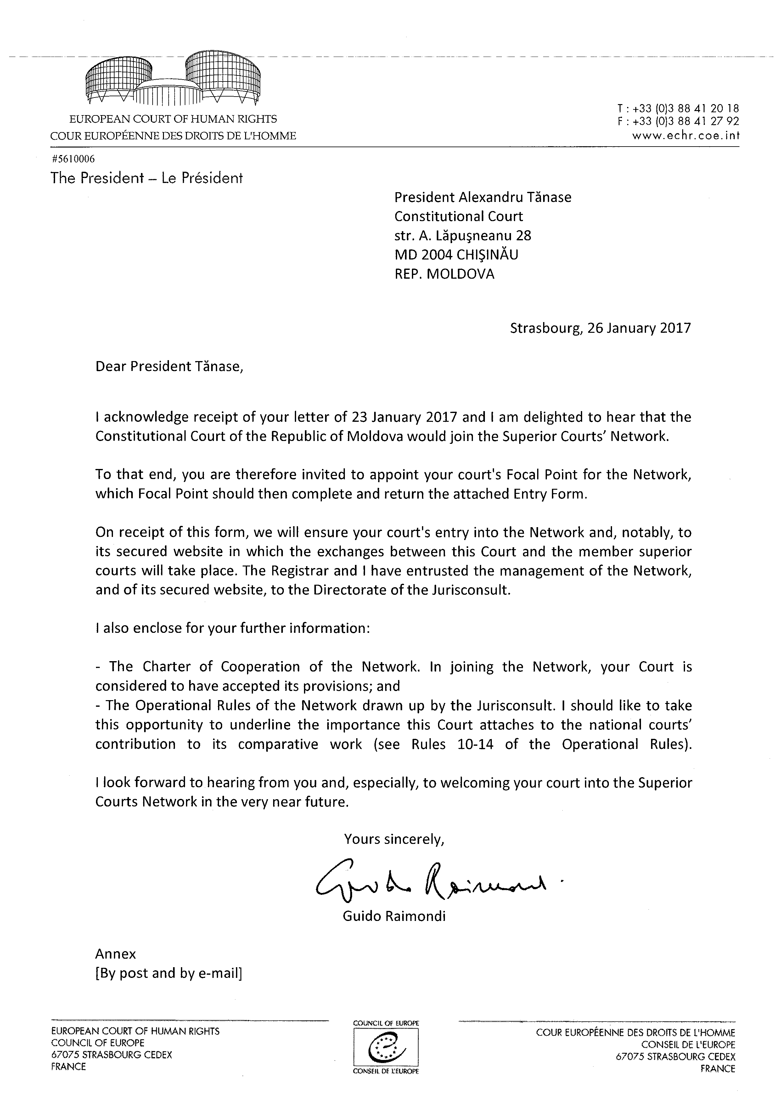 Curtea Constituțională a Republicii Moldova a fost acceptată în Rețeaua Curților Superioare (SCN) din cadrul Curții Europene a Drepturilor Omului (CEDO).